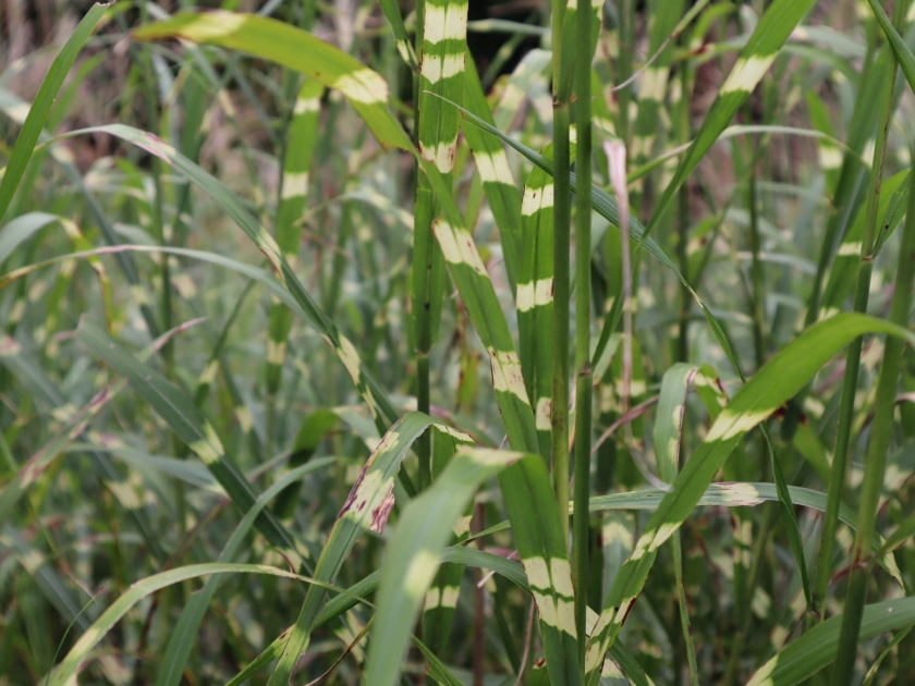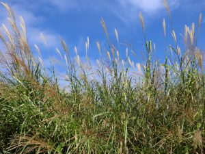 写真一枚目:タカノハススキ(鷹羽薄)、二枚目:葉っぱのアップ(場所:移ろいの庭、花の谷ほか)