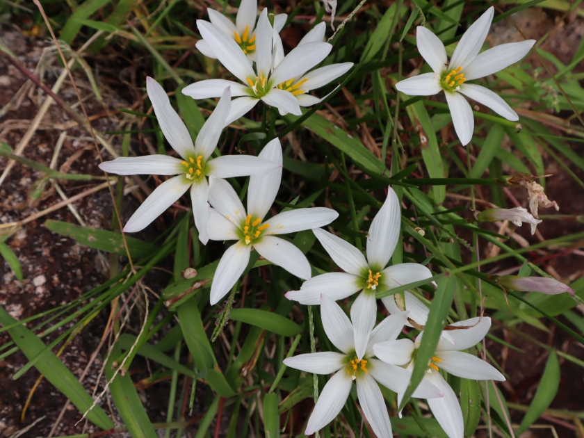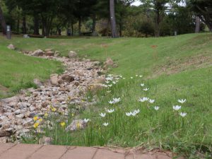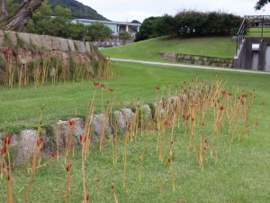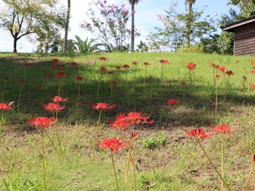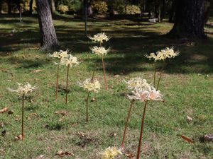 写真一・二枚目:シロバナマンジュシャゲ、三・四枚目:ゼフィランサス(タマスダレ)、五枚目:ヒガンバナ(場所:松の谷)、六枚目:移ろいの庭(南側)ヒガンバナの様子