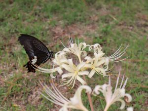 この時期のヒガンバナ科の花を見るため以外、お客様があまり踏み入らない松の谷。是非散策をお楽しみください。花の蜜がおいしいのか、蝶がブンブン舞っています。