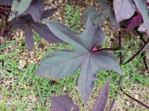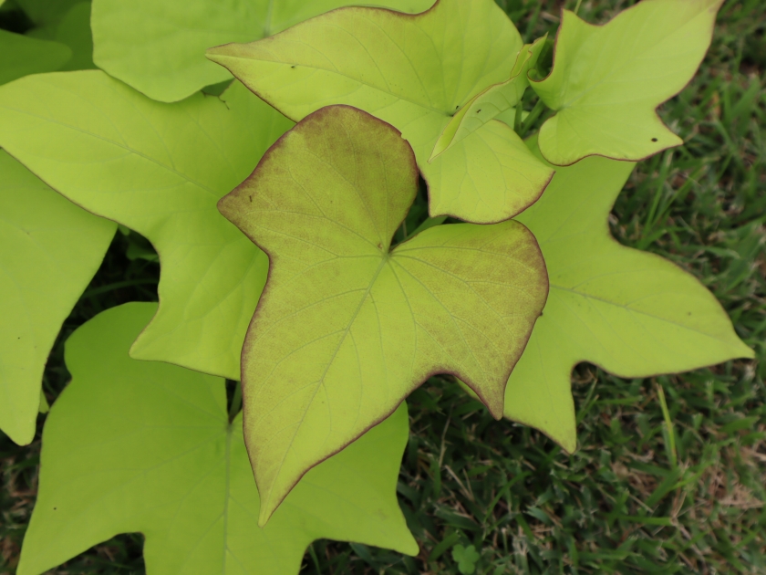 イポメアはサツマイモの葉っぱを観賞するために作られた園芸品種です。黄緑色のイポメアは、移ろいの庭階段花壇のクルクマの足元にもあります。カンナもイポメア同様に2品種植えてあります。