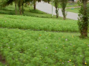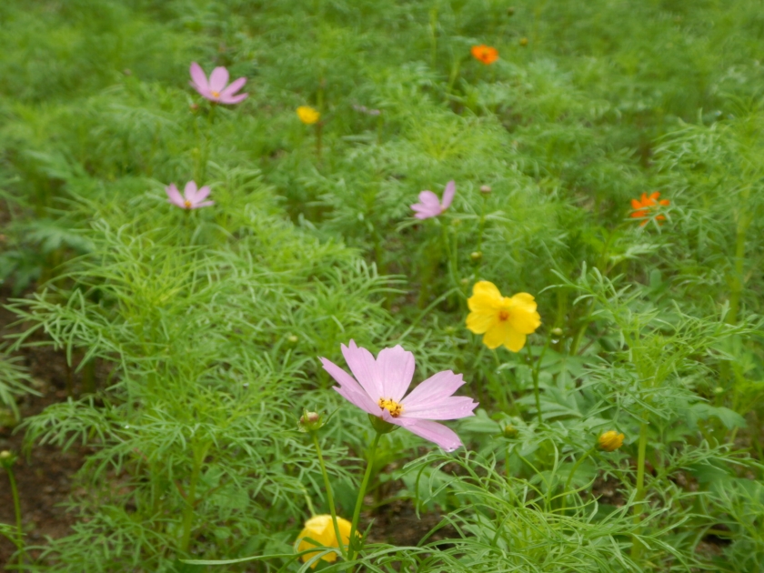コスモスがチラホラ咲き始めました!まだ見ごろとは言えませんが、緑のモフモフ絨毯の上にカラフルな水玉って感じでかわいいです。