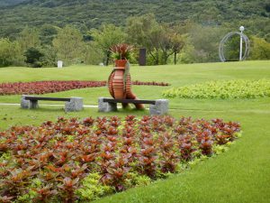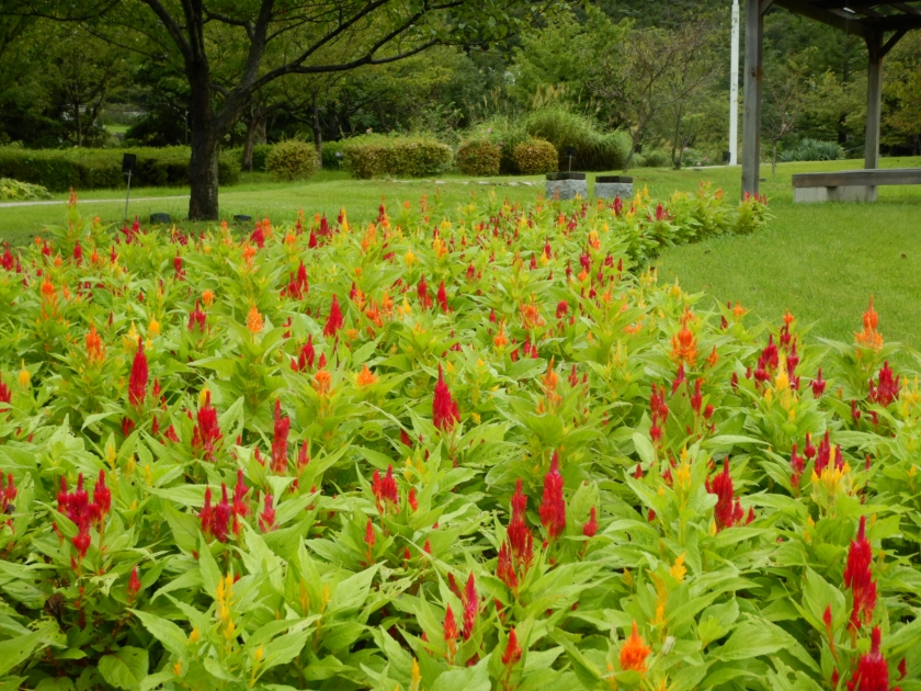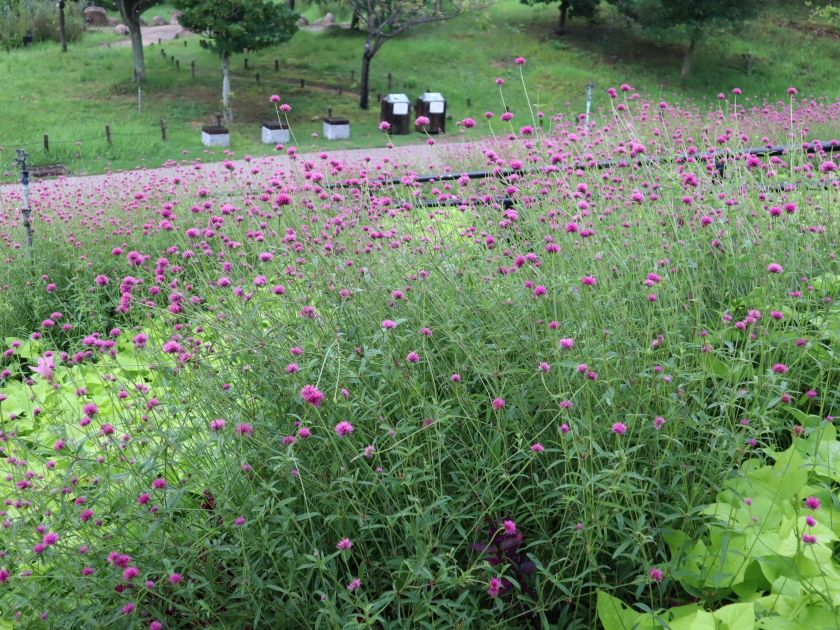 写真一・二枚目:センニチコウ‘ファイヤーワークス’(場所:移ろいの庭階段花壇、レストラン花屋敷前)