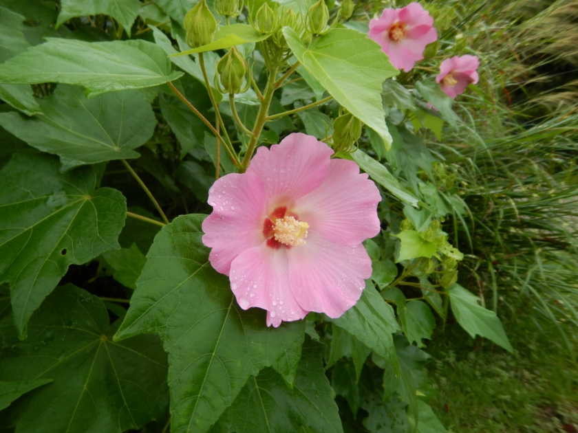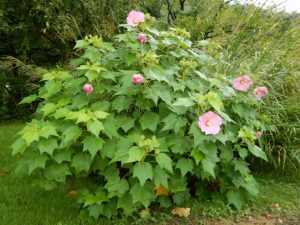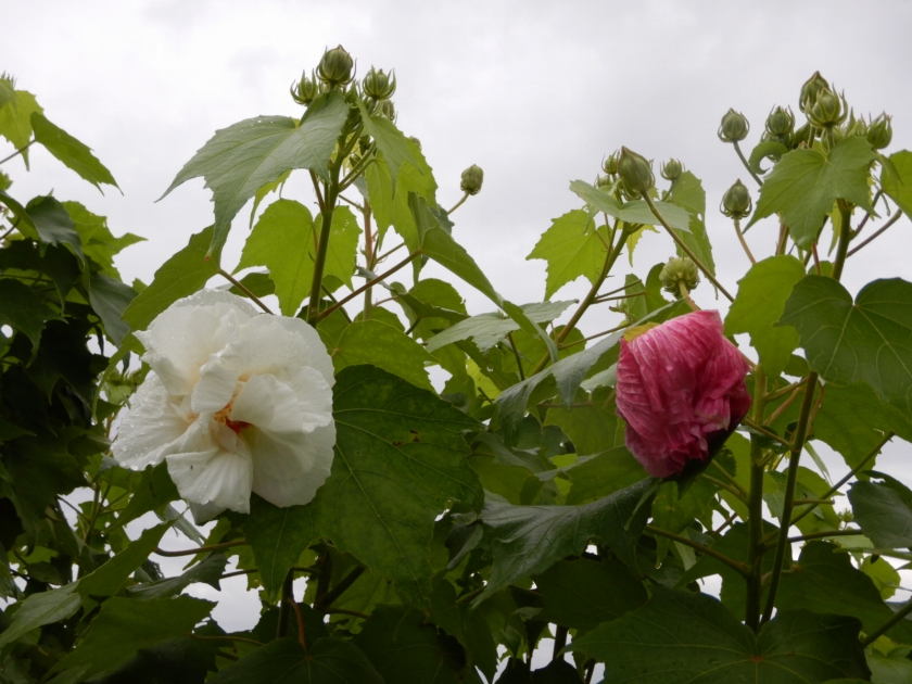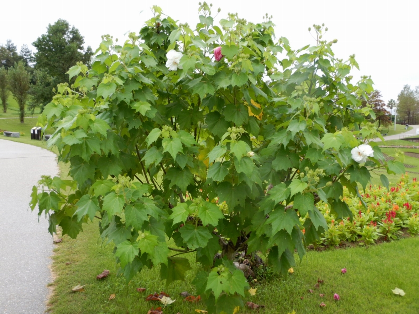 スイフヨウのそばに普通のフヨウも咲いています。開花して最初から最後まで同じ色のままです。白い花の木もあります。