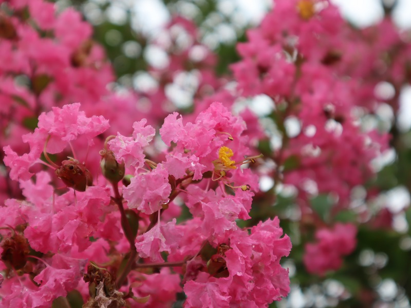 猿が滑るくらい木の幹がツルツルなサルスベリ。フリフリなお花が乙女チック。花の色は白、ピンク、紅色などがあります。
