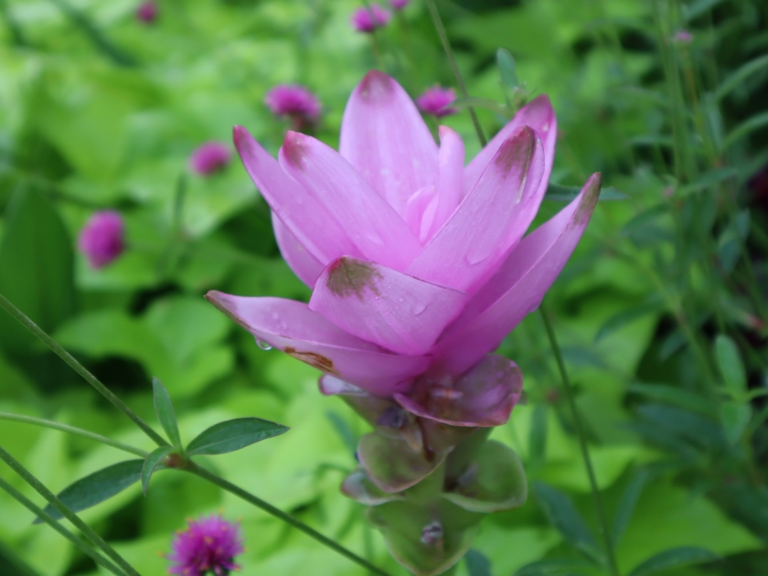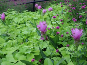 写真一・二枚目:クルクマ(場所:移ろいの庭階段花壇ほか)