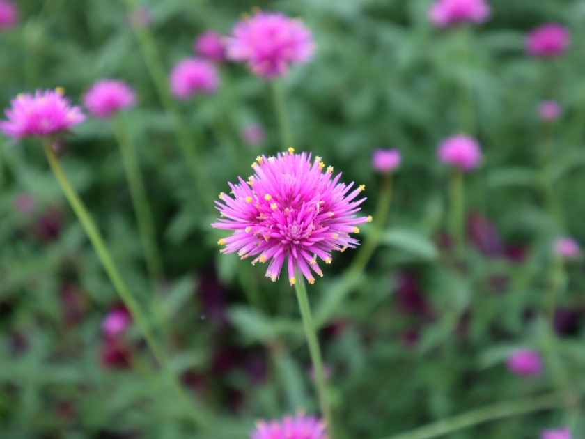 小ぶりのピンクのポンポンが茎の先にビョコビョコ出ています。名称通りに花火っぽい見た目の花です(ファイヤーワーク:花火)。