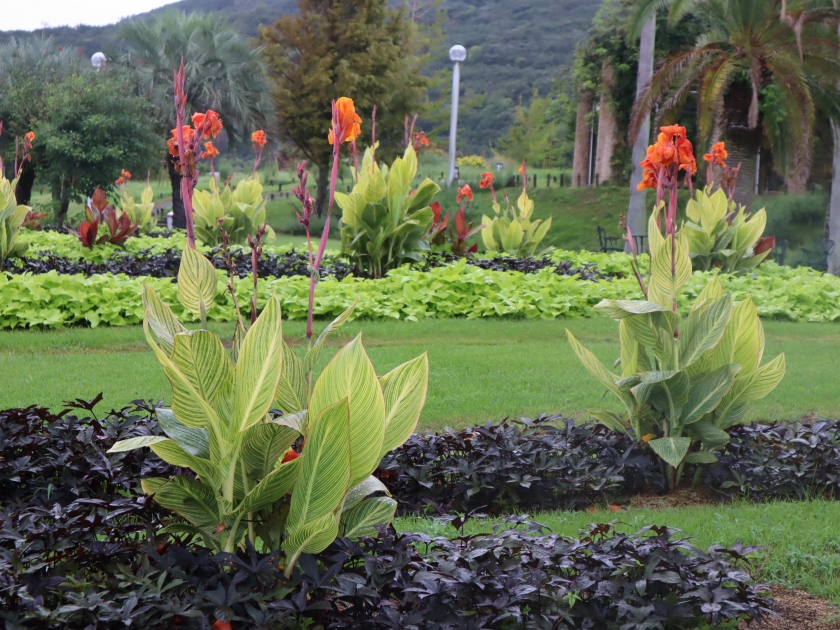 写真一・二枚目:イポメア、三枚目:カンナ(場所:パームガーデン)、四枚目:パームガーデンの様子
