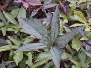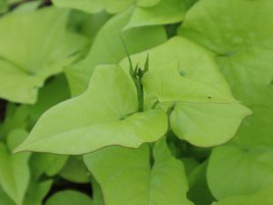 イポメアの葉っぱはサツマイモの葉っぱにそっくり。それもそのはず、イポメアはサツマイモの葉っぱを観賞するために作られた園芸品種です。黄緑色のイポメアは、移ろいの庭階段花壇のクルクマの足元にも植えてあります。
