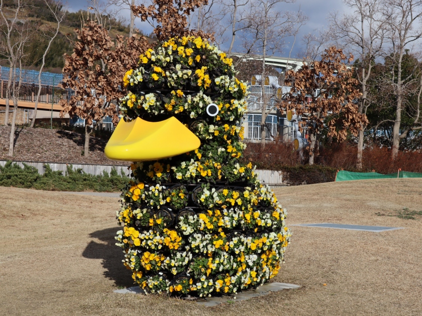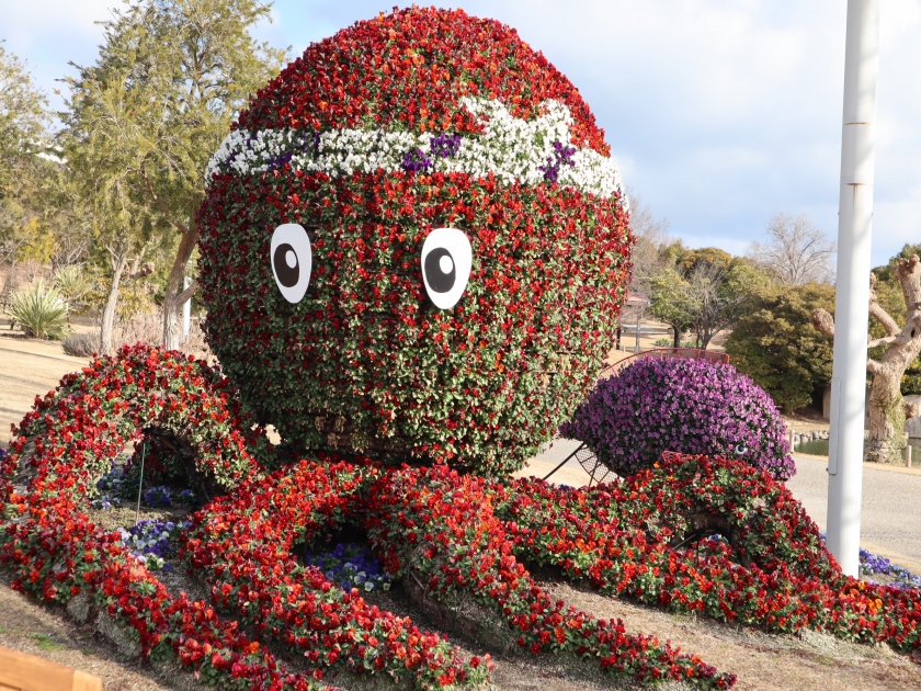 写真一枚目:立体花壇「花火鳥」(場所:大地の虹)、二枚目:立体花壇「アヒル」(場所:大地の虹)、三・四枚目:立体花壇「タコトピアリー」&「鯛」(場所:東浦口ゲートそば