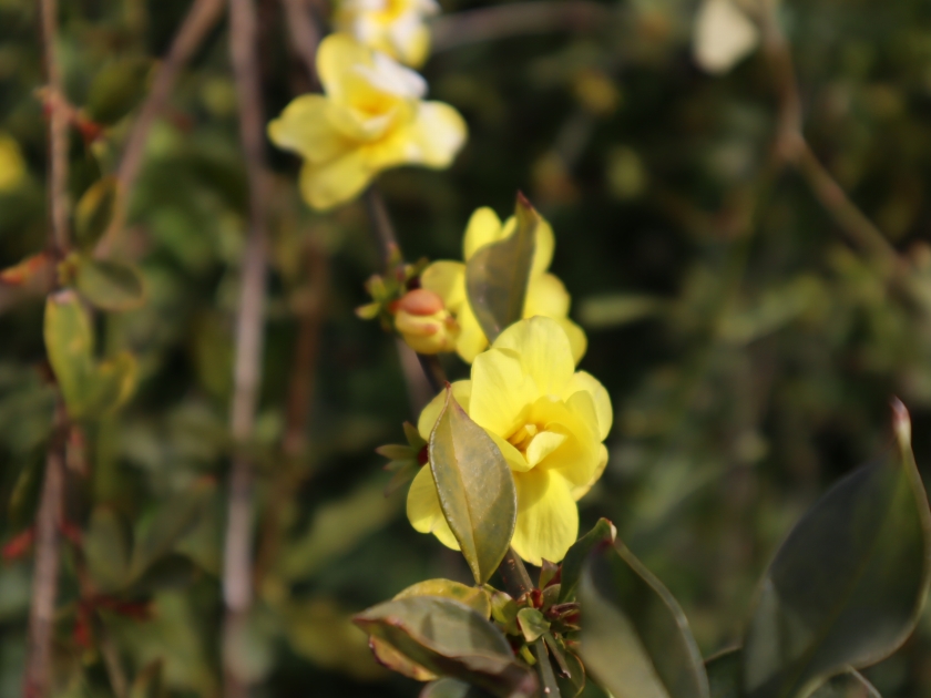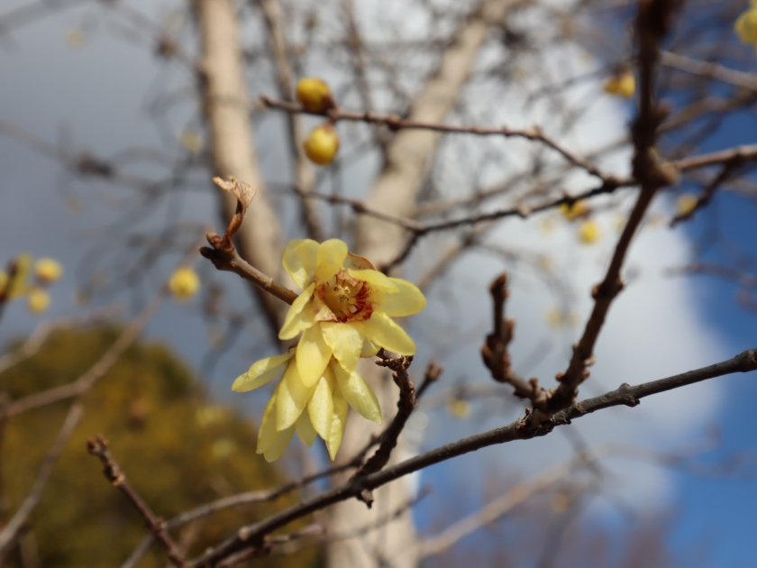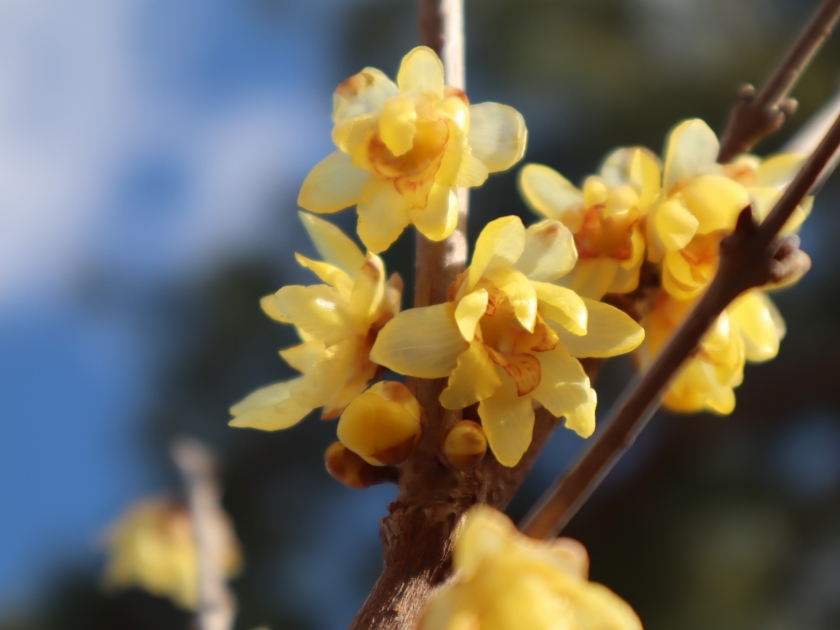 ロウバイ2本とマンゲツロウバイ1本(多分。ロウバイ類の判別は難しい!)。本数少ないながらも甘いいい香りをさせて咲いています。写真を撮る方には人気の被写体です。