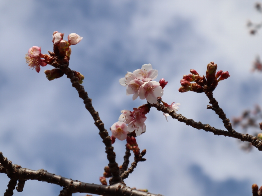冬に咲く桜、カンザクラが咲き始めています。春の桜のように一気に華やかにならず、ちょっとずつちょっとずつ開花していきます。