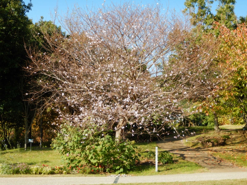 春だけでなく秋にも咲く桜が園内に何本かあります。一番見ごたえのあるアーコレードという品種の花数が増えてきました。そのそばに他の品種も咲いていますので、見比べてみてください。