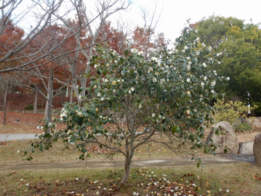 東浦口ゲート横の船着き場のそばや移ろいの庭の小高い丘にぐるりとあるカンツバキ。つぼみはたくさんあるためまだまだ咲きます。ワビスケは花の谷と松の谷の間の園路沿いに何本かあるのですが、現在開花は1本のみ。(15日撮影時には赤のヤブツバキが1輪開花していました)