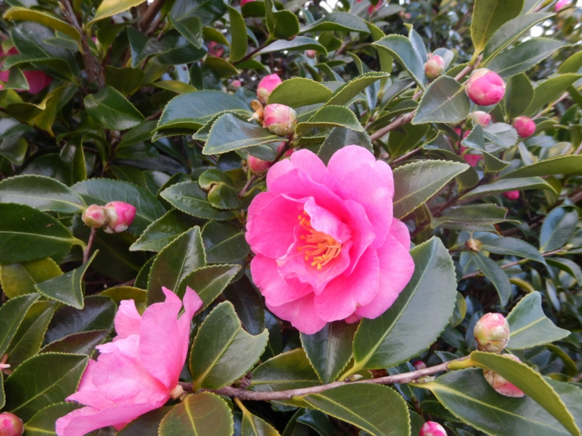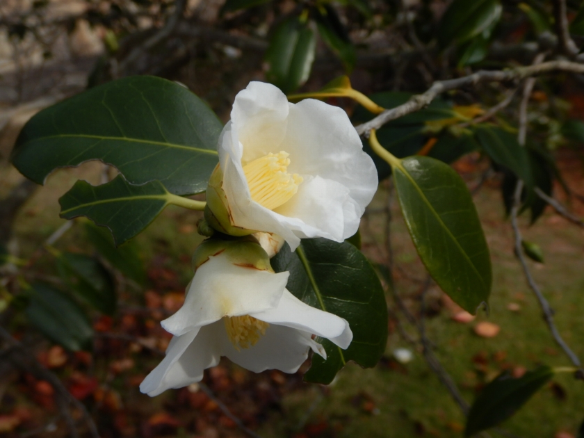 移ろいの庭の小高い丘にぐるりとあるカンツバキですが、いつ咲き始めたのか既に結構散っています。つぼみはたくさんあるため、まだまだ咲きますが。ワビスケは花の谷と松の谷の間の園路沿いに何本かあるのですが、現在開花は1本のみ。