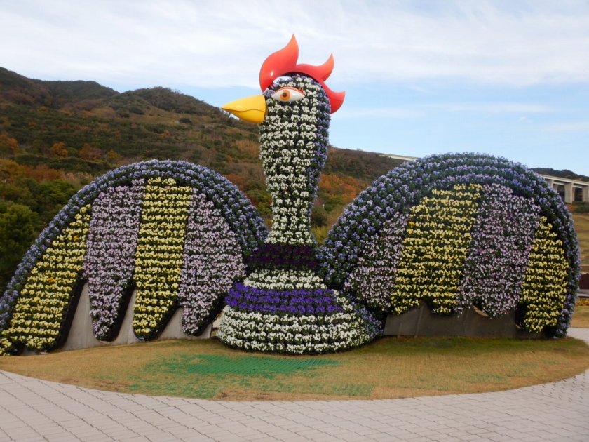 写真一枚目:立体花壇「花火鳥」、二枚目:立体花壇「アヒル」、三枚目:立体花壇「タコトピアリー」、四枚目:ビオラのアップ