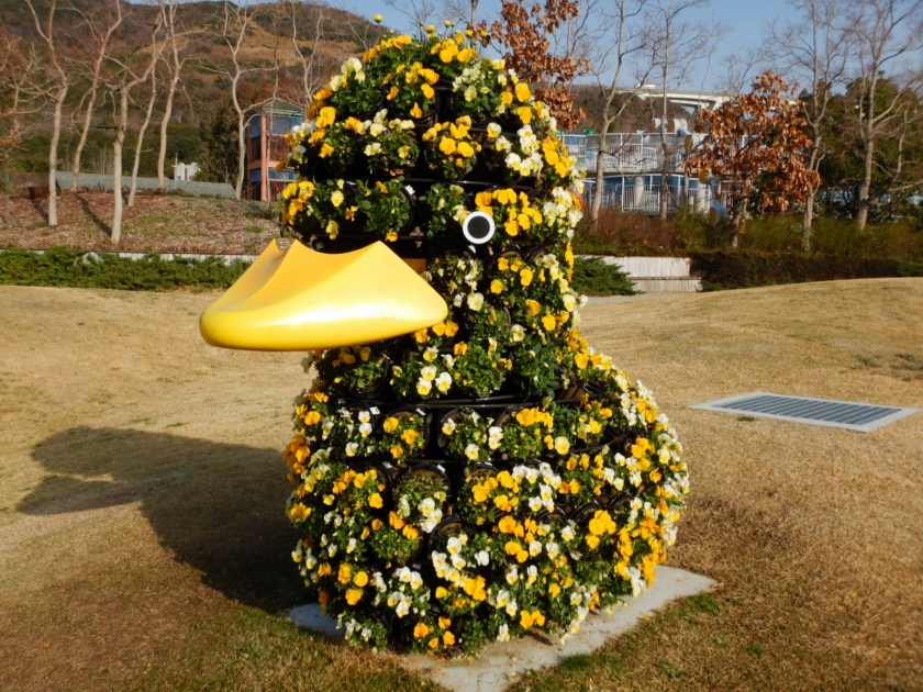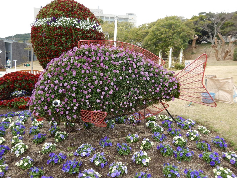 写真一枚目:立体花壇「花火鳥」(場所:大地の虹)、二枚目:立体花壇「アヒル」(場所:大地の虹)、三・四枚目:立体花壇「タコトピアリー」&「鯛」(場所:東浦口ゲートそば)