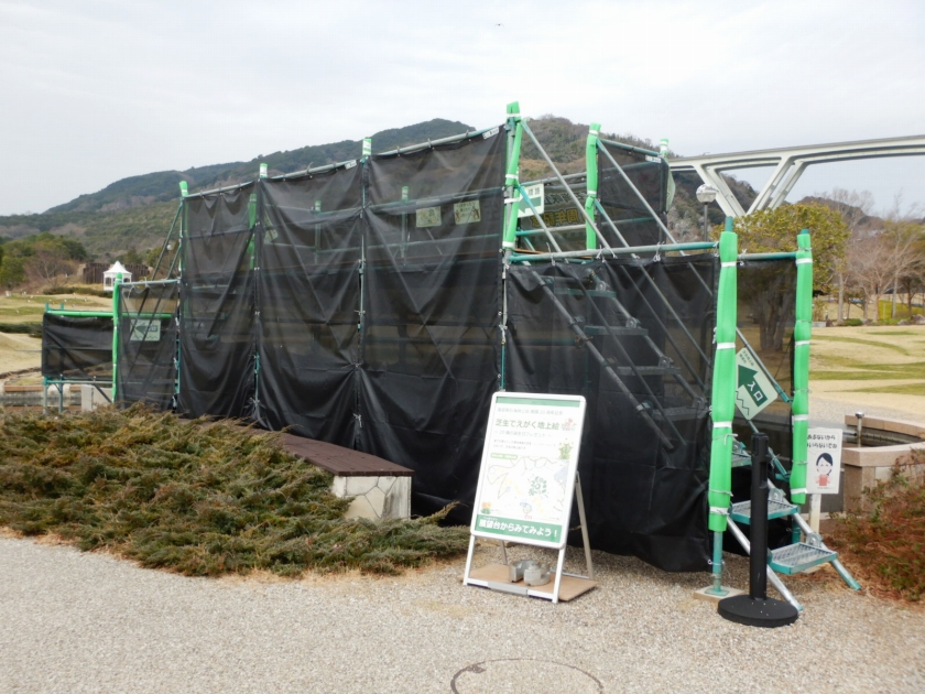 写真一枚目:仮設展望台前の案内看板、二枚目:芝生の地上絵(場所:移ろいの庭)