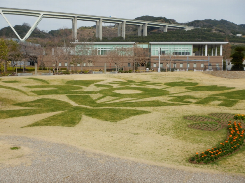 工事現場?!と見まがうばかりの足場が、移ろいの庭に物々しく出現。いぶかしく思うかもしれませんが上ってみてください。開園20周年記念を祝した、芝生で描いた地上絵を楽しめますよ。