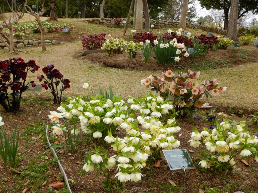 写真一枚目:品種「パラデニア」、二枚目:品種「パーティードレス ピンクピコティ」、三枚目:品種「ニゲルコルス‘ロイヤルソフィア’」、四枚目:クリスマスローズガーデンの一部