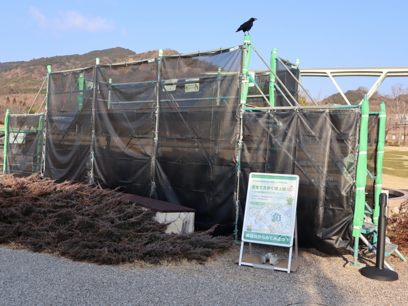 写真一枚目:仮設展望台、二枚目:芝生の地上絵(場所:移ろいの庭)