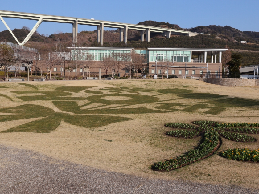 工事現場?!と見まがうばかりの足場が、移ろいの庭に物々しく出現。いぶかしく思うかもしれませんが上ってみてください。開園20周年記念を祝した、芝生で描いた地上絵を楽しめますよ。