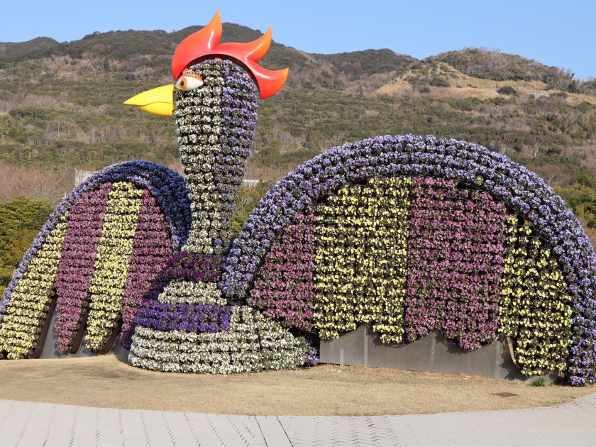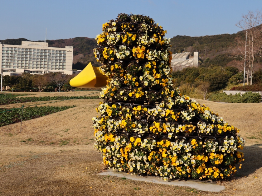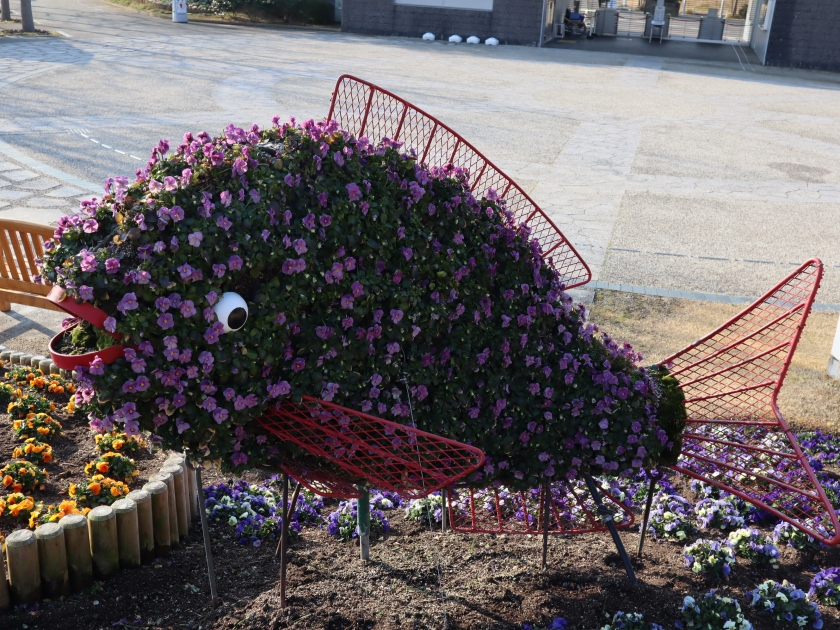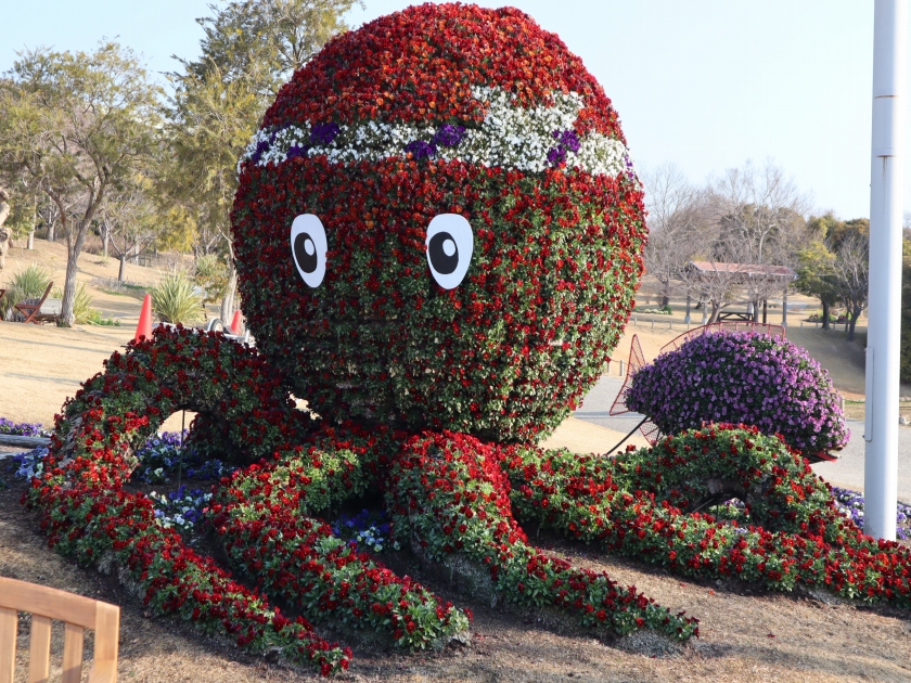 写真一枚目:立体花壇「花火鳥」(場所:大地の虹)、二枚目:立体花壇「アヒル」(場所:大地の虹)、三・四枚目:立体花壇「タコトピアリー」&「鯛」(場所:東浦口ゲートそば)
