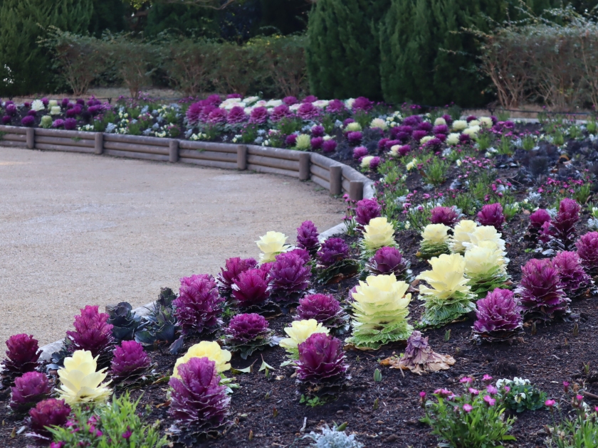 写真一・二枚目:ハボタン(場所:花の丘道 半円形花壇)