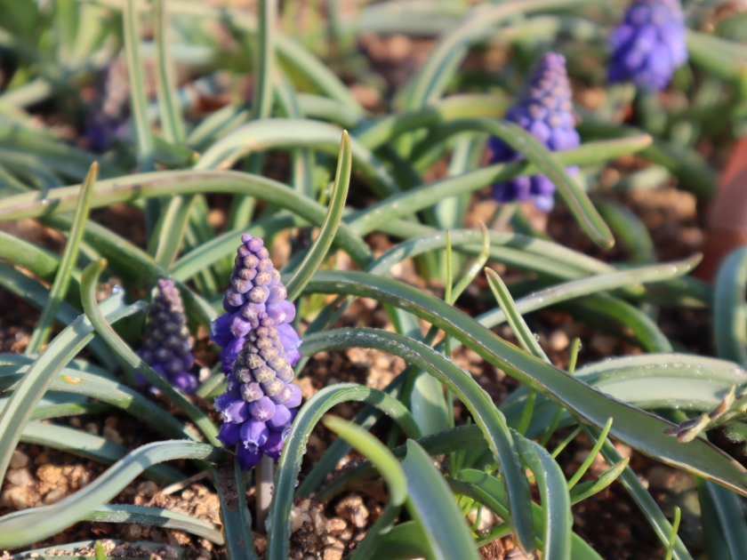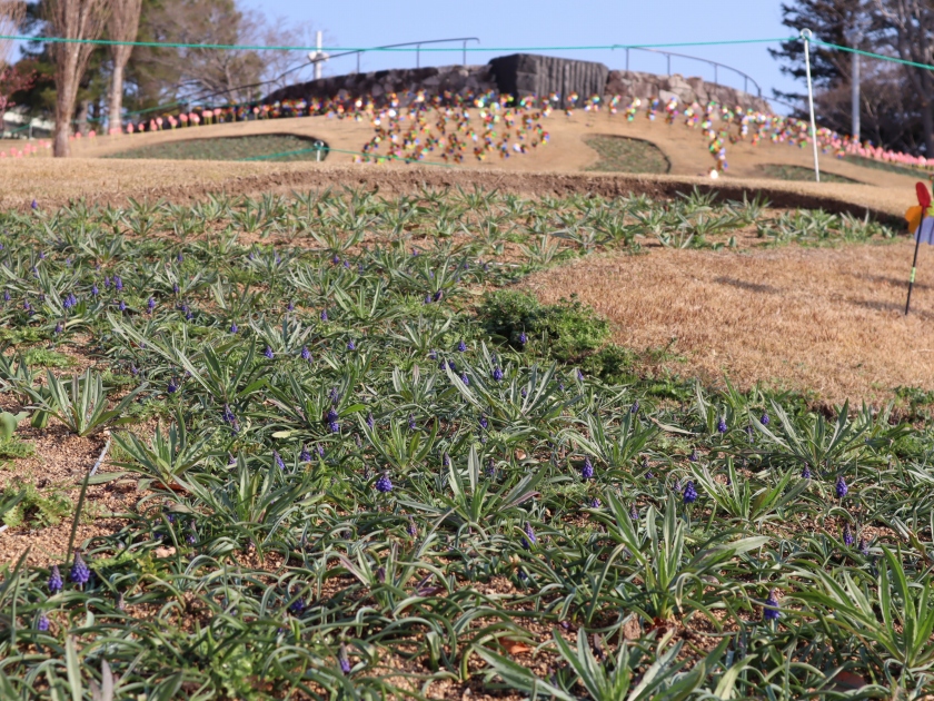 もうすぐ春の花で彩られるポプラの丘で、一足お先にムスカリが咲き始めました。(※写真で写っているかざぐるまの花は7日(月)以降撤去します。)