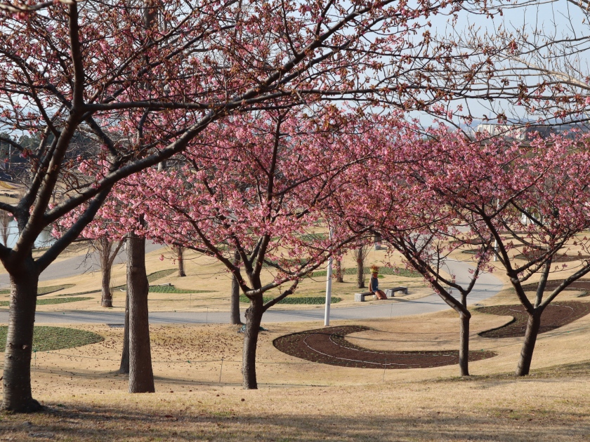 河津桜の木全体がピンク色に見えるようになってきました。本数が多いのは春一番の丘ですが、ポプラの丘の上段部にもあります。見上げると、変わった形のユリノキの実とのコラボも楽しめますよ。