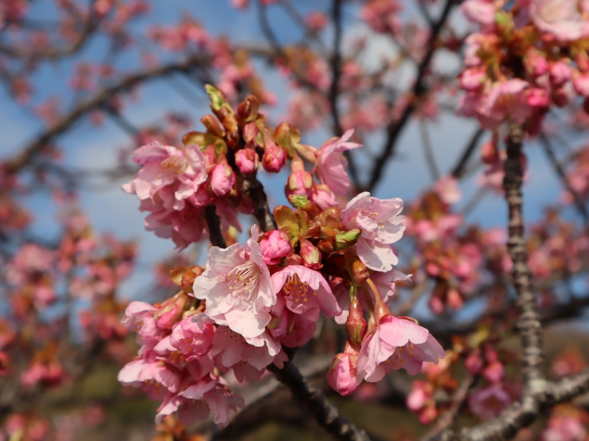 ・お待たせしました、河津桜がようやく見ごろになってきました。今日の時点で全体で5分咲き程度ですが、満開(8分咲き)に近い木もあります。