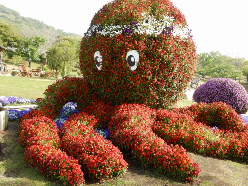 写真一枚目:立体花壇「花火鳥」(場所:大地の虹)、二枚目:立体花壇「アヒル」(場所:大地の虹)、三・四枚目:立体花壇「タコトピアリー」&「タイ」(場所:東浦口ゲートそば)