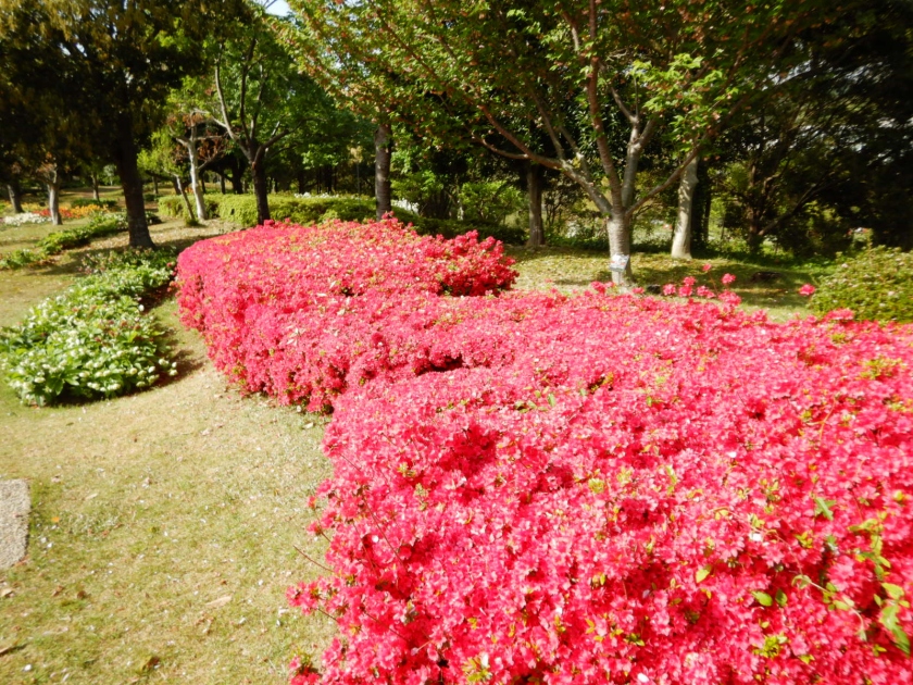 ポプラの丘の上段を眺めると目に入る真っ赤なかたまり。それがこのツツジです。