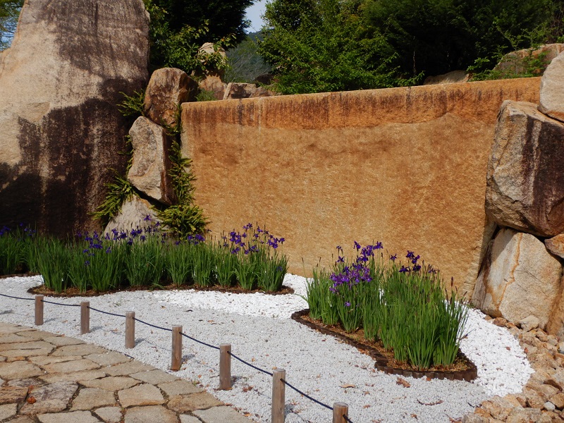 水の岩戸前は和風な空間。アヤメが上品に咲き始めました。