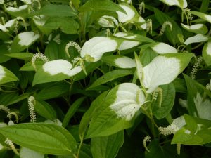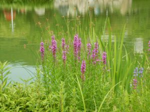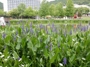ハンゲショウの葉っぱが着々と白くなっています。その間からブルーのポンテデリア、ピンクのミソハギがピョコピョコ咲いています。