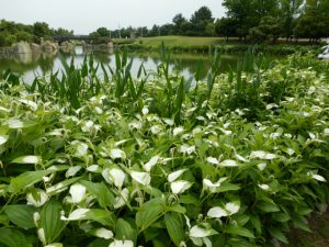 写真一・二枚目:ハンゲショウ、三・四枚目:ポンテデリア、五・六枚目:ミソハギ