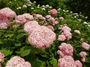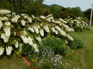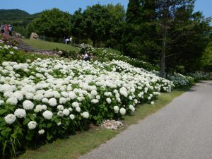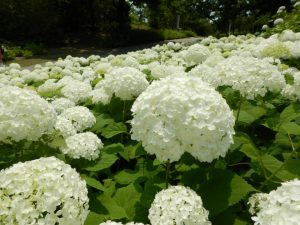 園路沿いに並んだ真っ白で大輪のアナベルが大人気です。