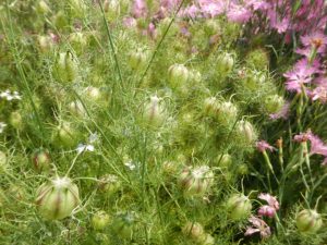 ユリが終了し、一緒に植えていたダイアンサスが満開になっています。ニゲラは花が終わり、面白い形の実でいっぱいです。