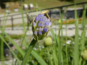 一本の花茎に薄紫のラッパ状の花が2~30集まって球のようになるアガパンサス。チラホラ開花していますが、球状になるのはあともう少し先です。