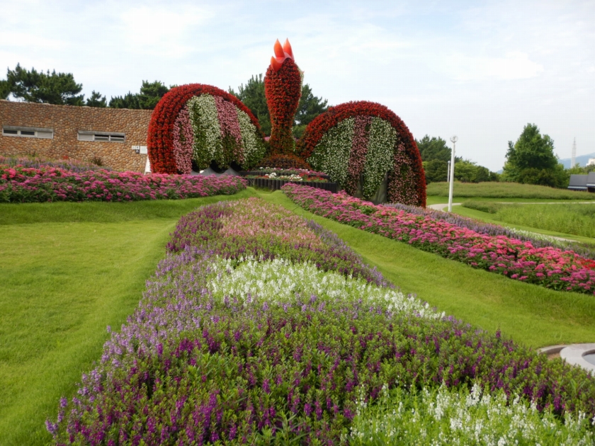 大地の虹にデデ~ンとそびえる立体花壇「花火鳥」。立体の後ろの部分が尾羽を表しているんですが、殆どの人が気づいていないはず。そこを含めて眺めてみてください、本当に大きい鳥なんですよ。