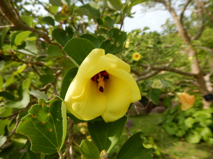 朝に開花して夕方にはしぼんで終わりの一日花。2メートル超の木に咲いていますが、花の見た目はオクラの花にそっくり。開花時期が短く、ピーク過ぎましたのでそろそろおしまいです。