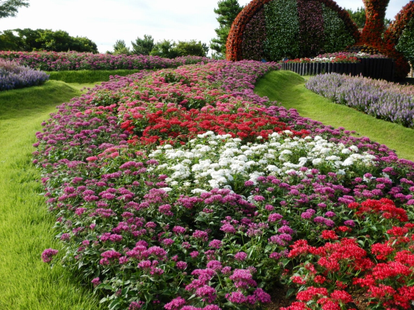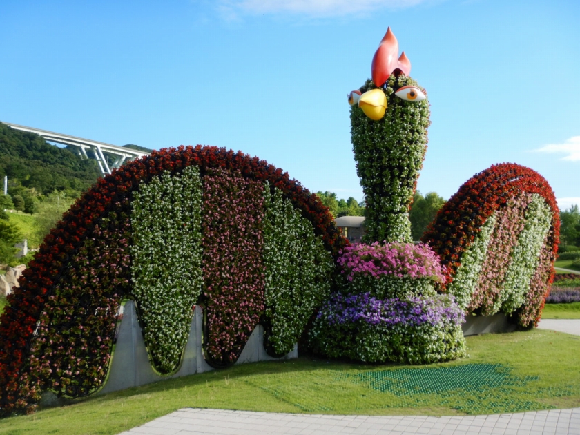 大地の虹にデデ~ンとそびえる立体花壇「花火鳥」。鳥の本体部分だけでも大きいのに、その立体の後ろの部分、尾羽部分を含めると本当に大きい鳥なのです。全国的にもここまで立派な常設の立体花壇はないのでは?!(あったら教えて下さい、見に行きたいです!)