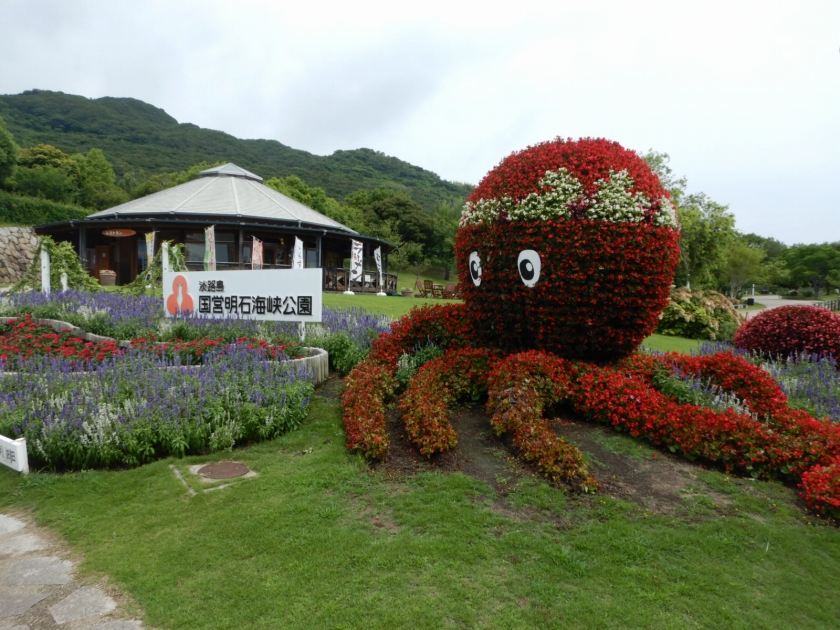 おすすめのフォトスポットの立体花壇「花火鳥&タコトピアリー」。ベースは赤桃白のベゴニアですが、周囲の花壇にもサルビアやペンタスなどいろいろな花がご覧いただけます。