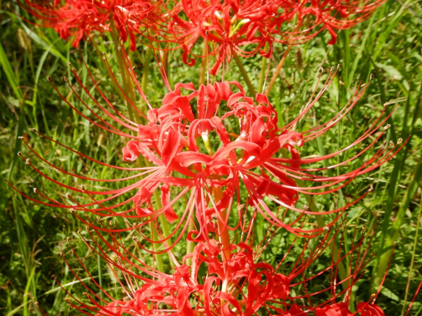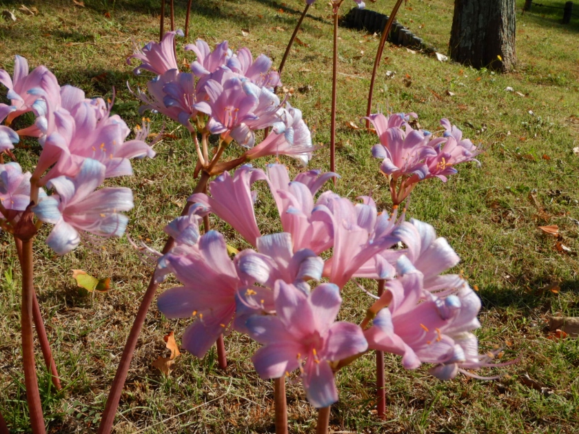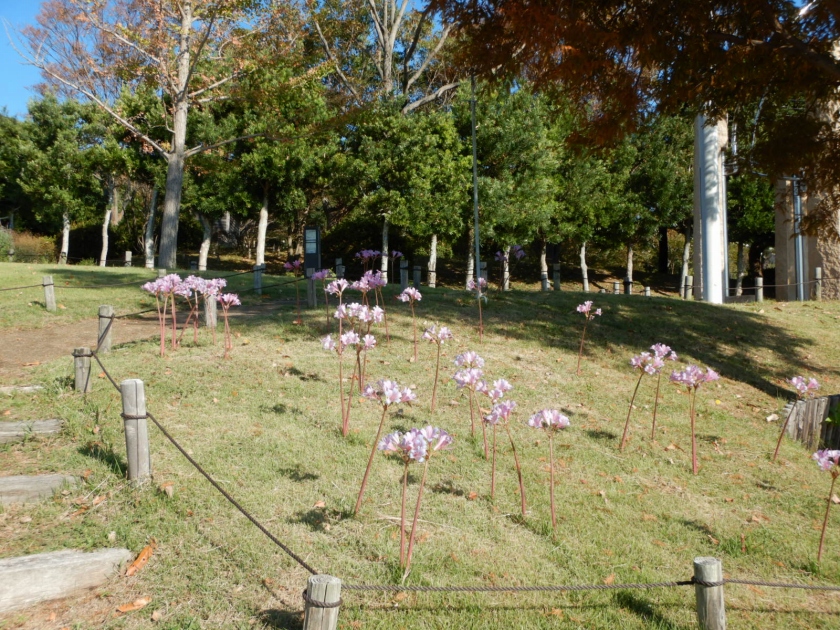 写真一・二枚目:シロバナマンジュシャゲ(松の谷)、三~五枚目:ムラサキキツネノカミソリ(陽だまりの丘とパームガーデンの間)、六枚目:タマスダレ(松の谷)