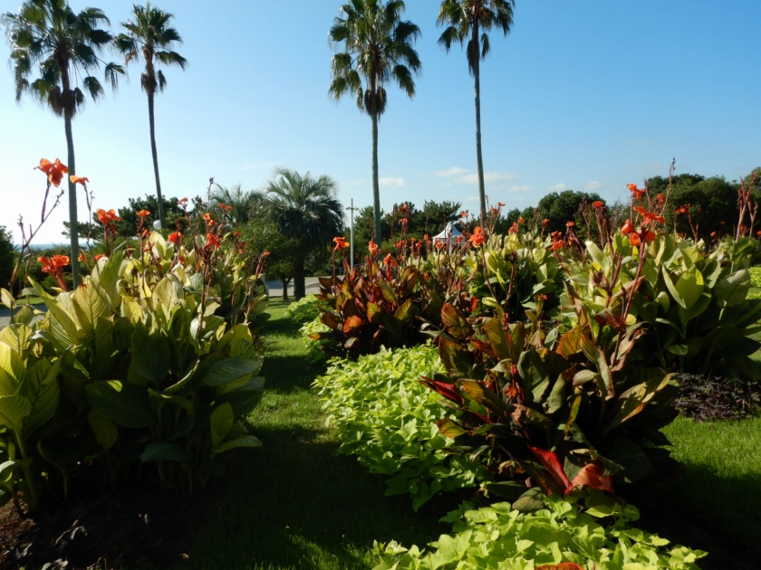 カンナとその足元に植わっているサツマイモの観賞用品種イポメア。海のそばで塩水もかかったはずなのに元気元気元気!たのもしい!