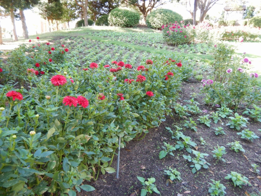 10月から楽しんでいただけるよう準備をしていた陽だまりの丘。背の高いダリアは先行して咲いています。が、周囲の背の低いダリアはまだまだ開花する様子が見られません。さらに台風の影響を受け、チリチリの部分も…。今年ははたしてきれいに咲くのか?!