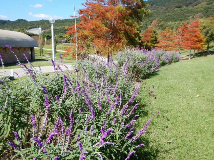 例年ですと花の丘道沿いがこの花で紫色に染まる感じなのですが、大半が台風の塩害でやられちゃいました。レウカンサを見たい方は、今年はこの場所にどうぞ。