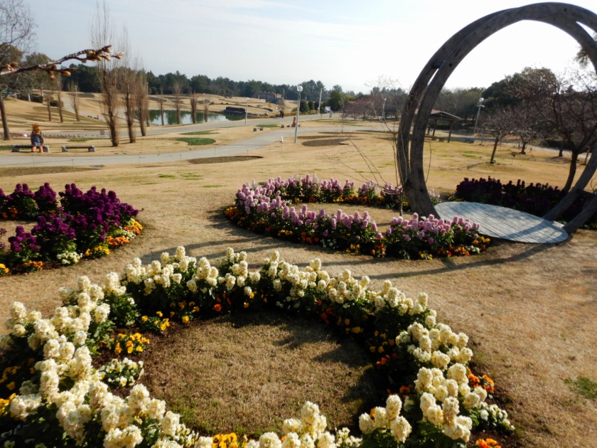 移ろいの庭の芝生が茶色と緑色のまだらになっていますが、よく見ると模様なのです。この1月15日で都市公園制度が制定されて150周年。それを芝生の絵で表してみました。見やすいように観覧お立ち台を設置しましたので、上ってみてください。