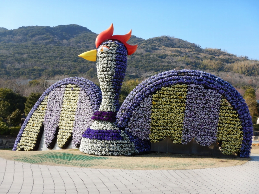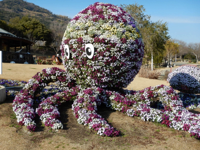 写真一枚目:立体花壇「花火鳥」、二枚目:立体花壇「タコトピアリー」