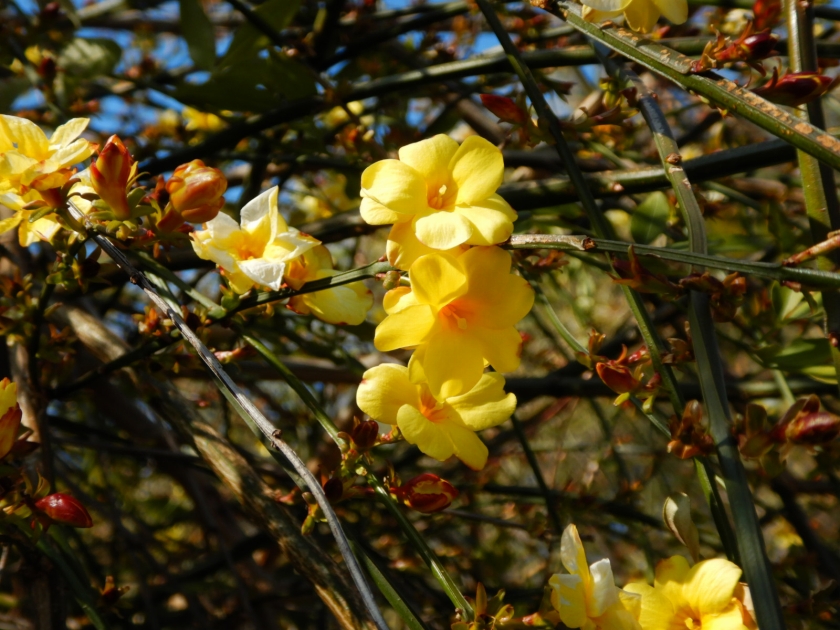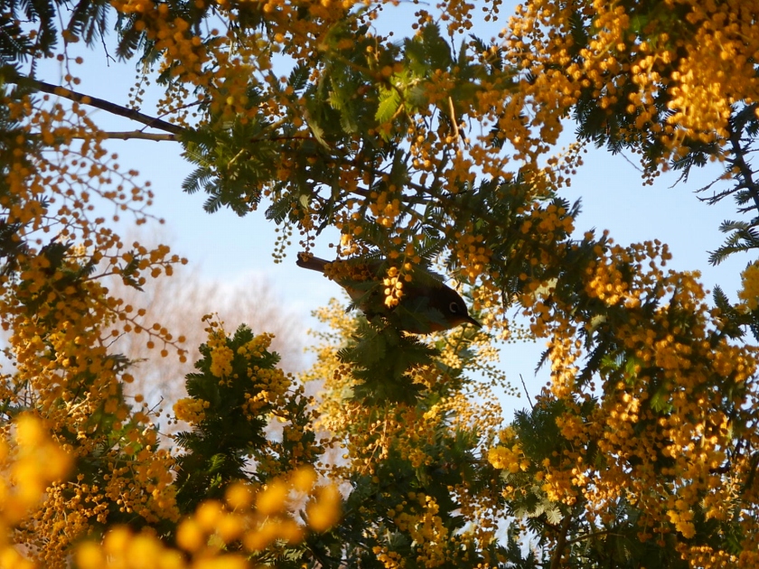 鮮やかな黄色の花が青空に映えます。開花は日に日に増えているのですが、今年は花の丘道沿いにメジロ、ヒヨドリ、ムクドリなどの鳥が非常に多くたむろしており、咲いた花をついばまれてしまっています。