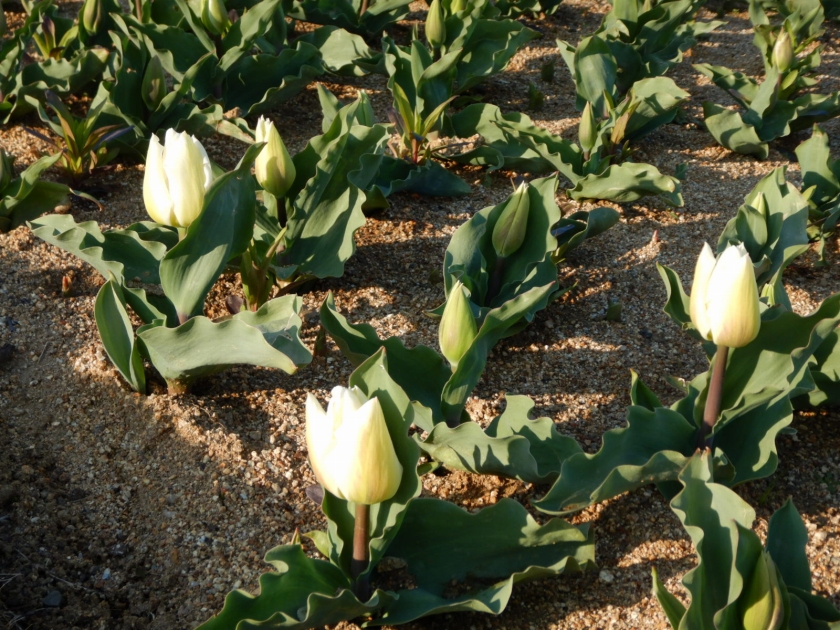 さて、そのかざぐるまの足元や周りでは、春のお花の苗たちが着々と育っています。フライング気味のチューリップが目に付き始めました。